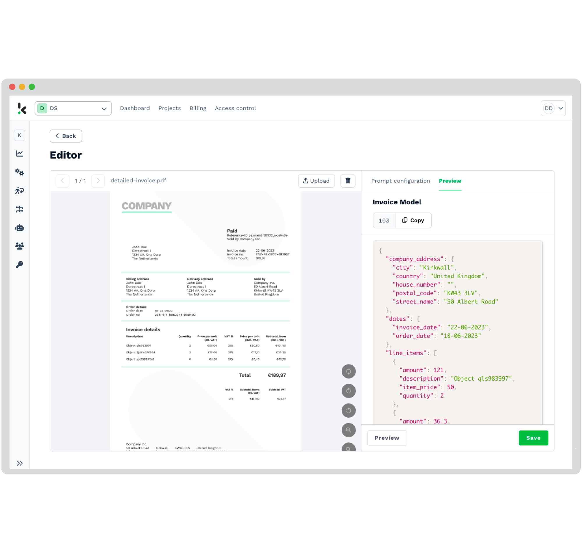 - Supports 150+ languages and various formats, including JSON, PDF/A, CSV, XML, XLSX, UBL.